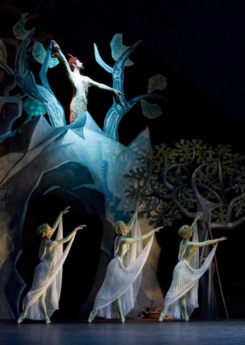 Only two costumes survived this petty holocaust — the ones which Margot Fonteyn had herself given to the Opera House’s archive. Nor were there drawings from which the originals might be recreated, for many of them had come about through the combined efforts of Craxton, Ashton and Fonteyn. Time was short, and the three not only shared a common artistic aim, but also understood how the project might be realised. Costumes could even be improvised from a bolt of cloth, if necessary. For that original production, Craxton painted all the scenery by hand himself. To recreate it in 2004, he had to rely on his memory, a few photographs and the album cover of a Decca long-playing record of the ballet. Rather amazingly, Craxton has triumphantly summoned forth once more his enchanted island setting, with cave-mouth, vine pergola, barren rocks and fig and olive trees. I visited him at the Royal Opera House production workshops in Bow Industrial Park in east London. There he was putting the finishing touches to some olive trees, which he was painting on their sides.