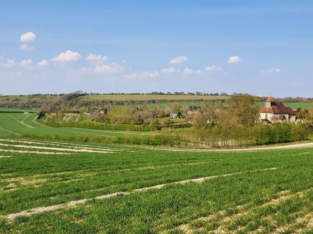 The South Downs, and Chilcomb church at Chilcomb near Winchester, England, UK, Easter 2020